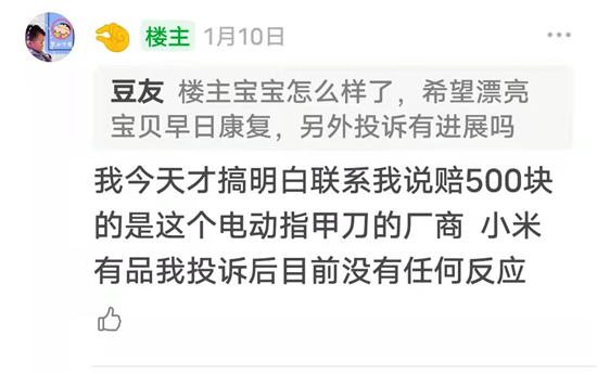 對(duì)于事件本身,有網(wǎng)友指責(zé)廠家對(duì)于產(chǎn)品只強(qiáng)調(diào)安全但沒(méi)有強(qiáng)調(diào)安全的限制范圍,也有網(wǎng)友認(rèn)為主要責(zé)任在于家長(zhǎng)讓小朋友獨(dú)自接觸了電動(dòng)指甲刀產(chǎn)品……截至目前,樓主并沒(méi)有在豆瓣更新與商家間協(xié)商的進(jìn)程,整個(gè)事件的評(píng)判可能還是要交給相關(guān)部們由專業(yè)人士來(lái)判定了。