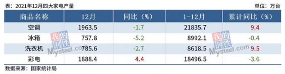 12月全國冰箱產量757.8萬臺,同比下降5.2%;1-12月累計產量8992.1萬臺,同比下降0.4%。