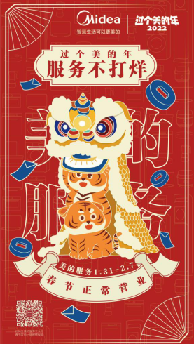 美的在全國人民歡度春節期間仍提供品質服務,2022年1月31日-2月7日(農歷臘月三十至正月初七)正常受理用戶服務請求,確保用戶春節期間正常享受產品安裝、維修、深度清洗等服務,并按照服務規范及標準開展服務工作,讓用戶輕松愜意過個爽快的新年。