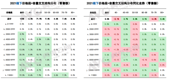相比起線上的“博愛”,線下市場主要集中在60L以下產品。其中7000-7999元價格段的產品零售額近四成,線下高端市場可待發掘。