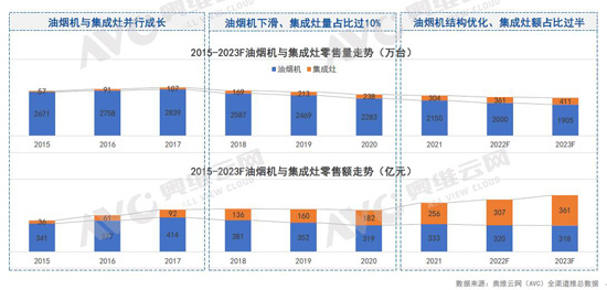 據奧維云網(AVC)推總數據顯示,2021年集成灶市場規模304萬臺、256億元,零售量同比增長28%,零售額同比增長41%,同比2019年零售量增長43%,零售額增長60%。2021年集成灶零售量與油煙機零售量之比約為1:7,2019年為1:12。集成灶零售量與燃氣灶零售量之比接近1:8,2019年為1:14。