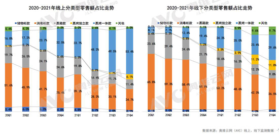 奧維云網(AVC)監測數據顯示,線上市場,蒸烤一體集成灶零售額占比從2021年一季度的33.7%上升到了四季度的53.4%;線下市場則從2021年一季度的24.3%上升到了四季度的29.6%,蒸烤獨立集成灶零售額份額則2021年一季度的3.3%上升到了四季度的11.8%。