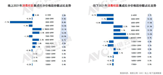 但就“消毒柜款集成灶”和“蒸箱款集成灶”而言,同樣存在“推高賣新”的現象。比如消毒柜集成灶雖然以中低端為主,但是在產業升級的推動下,中端占比大幅提升。而蒸箱款集成灶則出現了線上腰部向高端轉移,線下高端向腰部轉移的現象。