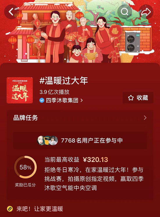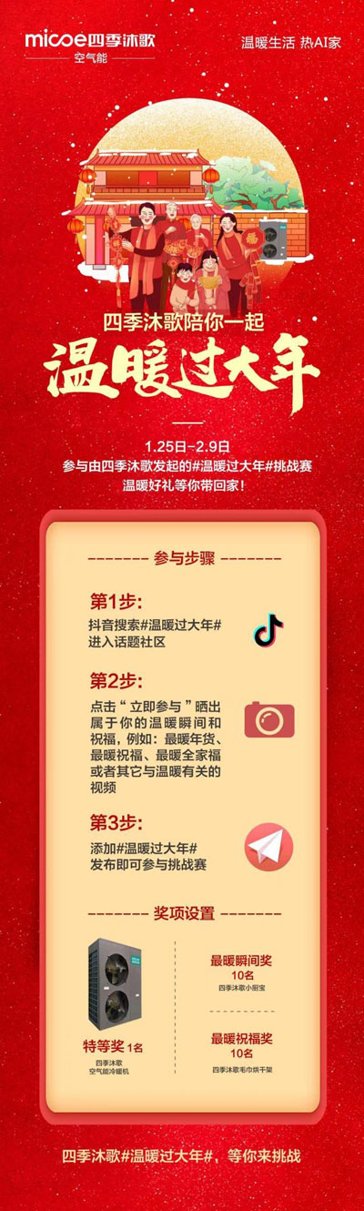 這個春節(jié),無懼嚴(yán)寒,四季沐歌帶你感受四季如春的溫暖,用創(chuàng)新科技將溫暖傳遞給千家萬戶。而在這喜慶暖心的闔家團(tuán)圓里,四季沐歌同樣希望把這份“溫暖”帶給大家。為此,四季沐歌特別發(fā)起#溫暖過大年#抖音區(qū)域挑戰(zhàn)賽活動,只要你在活動期間拿起手機(jī)打開抖音,參與#溫暖過大年#挑戰(zhàn)賽話題,點擊“立即參與”并曬出屬于你的溫暖瞬間與祝福,如“最暖年貨”、“最暖祝福”等,最后添加#溫暖過大年#,簡單幾步即可成功參與挑戰(zhàn),和全民一起來PK。