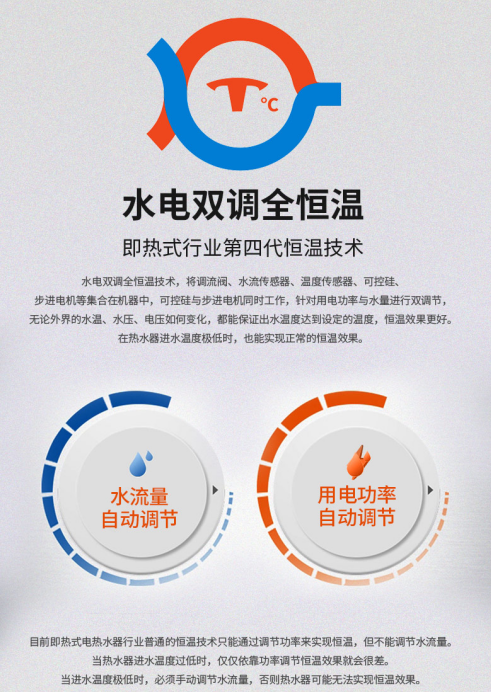 電熱水器在使用過程中,受水壓、電壓、進水溫度、出水溫度、內膽熱水輸出的變化、加熱功率等各個因素的影響,水溫會出現不穩定的情況。即熱式電熱水器行業經過幾十年的發展,經歷了檔位調節、無級調溫、智能變頻恒溫等技術,水電雙調全恒溫技術這四個階段。與普通的恒溫技術相比,水電雙調全恒溫技術解決了水溫、水壓、電壓變化及隔室安裝熱水器的水溫變化問題,沐浴更加舒適。