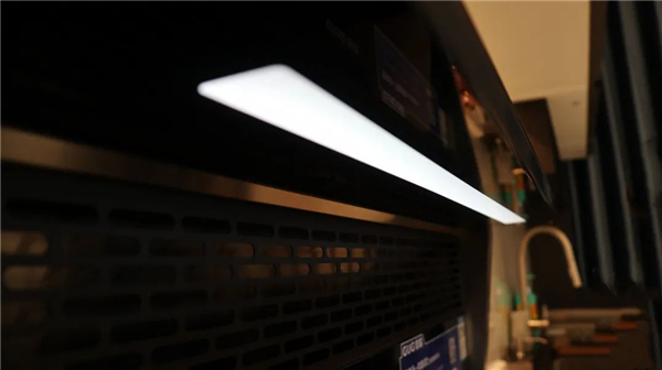 置物臺的背面則是一個長條LED燈,在沒有其他燈光輔助照明的情況下,亮度也足夠照亮整個灶臺,LED燈內(nèi)嵌在鋼化玻璃上,摸起來無縫也無凸起,沾上灰塵、油污也很好清理。