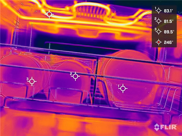 高溫消毒過程中,我們用多光譜紅外儀探測蒸烤箱內(nèi)部溫度,測得加熱管的溫度高達246℃,各個位置的碗碟溫度被加熱至80℃以上,能起到很好的消毒殺菌效果。