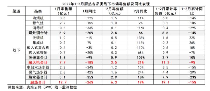 此外,奧維云網(wǎng)預(yù)計(jì),2022年一季度廚電整體(煙灶消洗嵌集)雖然有新興品類的高增長(zhǎng)拉動(dòng),但全渠道零售額同比會(huì)有小幅下滑,其中線上市場(chǎng)會(huì)保持10%左右高增長(zhǎng)。熱水器市場(chǎng)整體會(huì)有10%以上的下滑,一是1-2月累計(jì)下滑較為明顯,二是3月同期基數(shù)較高,目前來看電熱無(wú)論在線上還是線下都出現(xiàn)了大幅下滑。