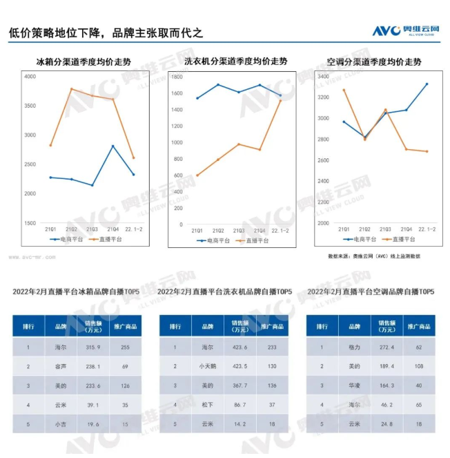 隨著頭部品牌加速進入直播渠道,并借助直播平臺展開新一輪的市場拓展。直播渠道的爭奪快速呈現品牌化、集中化趨勢,直播渠道不再只是以低價策略吸引消費者,也會帶來探索未來發展空間和動力的策略。2021年直播平臺冰箱市場均價為3617元,以天貓、京東為代表的電商平臺冰箱均價為2365元,直播平臺冰箱均價高于電商平臺1252元。空調直播平臺均價2856元,電商平臺均價2934元,價差僅為78元。價格差異的背后,主要來自于直播電商的消費人群有別于天貓、京東等電商平臺,集中在35歲左右的小鎮青年。基于這樣的人群基礎,一方面TOP品牌在下沉市場有更高的品牌認知與優勢,另一方面直播電商通過更精準的興趣推薦,轉化不同消費需求,形成多元化的消費結構。洗衣機較為特殊,因產品離散程度較高,直播平臺主推是以輕小洗、內衣機為主,與其他電商平臺在產品上差異較大,21年均價僅為836元。從分季度走勢來看,冰箱、洗衣機、空調品類的價格逐漸趨同,這無疑是品牌加大布局以及競爭帶來的結果,拉動家電企業在直播渠道“推高賣精”營銷轉型落地。