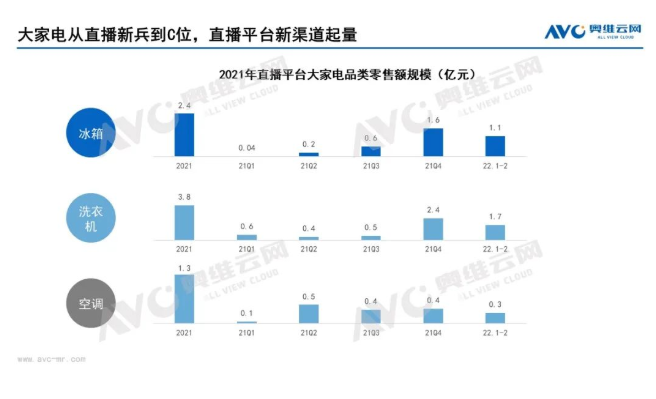 據奧維云網(AVC)《大家電直播電商平臺分析報告》,2021年直播平臺大家電冰箱、洗衣機、空調三大品類零售額分別為2.4億元、3.8億元、1.3億元,均已達到較為可觀的體量。分季度來看,大家電從Q1開始逐步起量,冰箱從21年Q1的0.04億元增長到Q4的1.6億元。洗衣機從0.6億元逐漸增長到2.4億元。空調也從0.1億元發展到0.4億元的規模,發展勢頭強勁。奧維云網大家電研究員王蕾認為,由于抖音快手等直播、短視頻平臺加速商業化變現,直播平臺和企業互動加強,品牌企業開始重視直播平臺的業務增量以及內容運營對私域流量的導流作用,在業務模式和大家電產品的物流配送安裝以及售后服務等商業流程的跑通和逐步完善后,2022年極有可能迎來大家電直播電商發展的元年,品牌企業快速布局正當其時。