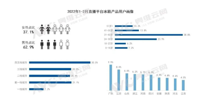 用戶方面以冰箱為例,直播平臺中男性是購買的主力人群,占比62.9%,而女性僅為37.1%。從年齡分布來看,80、90后年輕用戶占絕對優勢,其中31-40歲占比為38.8%。這些用戶具體到城市級別的分布情況,四五線城市占比最高為30.5%,其次是新一線城市21.1%、三線城市20.9%。從用戶畫像中不難看出,大家電領域依舊是下沉市場青年男性偏好度較高,主要原因也是由于較高的經濟能力以及對品質生活的追求使得這些高活躍用戶更愿意接受和嘗試新鮮事物。