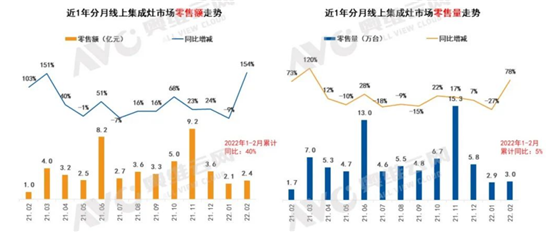 時間來到2022年,集成灶整體仍舊延續(xù)著強勢的增長勢頭,據奧維云網數(shù)據顯示,2022年1、2月份全渠道零售合計22.0萬臺、20.1億元,零售量同比增長9.9%、零售額同比增長25.9%,可見市場需求龐大。