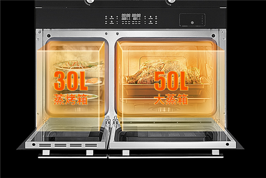 金帝X900KX2雙腔蒸烤消集成灶采用雙腔結構設計,左腔為30L容量的蒸烤一體箱,可以應對日常美食的烹飪;右腔為消毒儲物一體的50L消毒柜,可以輕松容納8碗8盤。這樣創(chuàng)新的設計,一方面滿足了小家庭的蒸烤需求,同時也能兼顧餐具的消毒儲存,將集成灶的空間利用到了極致,堪稱小戶型廚房的首選。