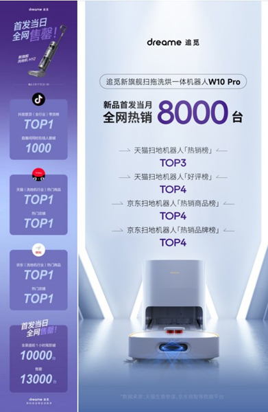 而對于極致的追求,正在不斷幫助追覓贏得市場的肯定。2022年3月,追覓科技先后發布新品掃拖一體機器人W10 Pro及新旗艦洗地機H12。其中,集掃、拖、洗、烘、除菌于一體的W10 Pro全網熱銷8000臺,“五合一”的解決方案讓用戶更好地解放雙手、簡單生活。而新旗艦洗地機H12更是在首發當日全網售罄13000臺,榮獲抖音、天貓、京東全網洗地機熱銷榜TOP1的好成績,同時在3月抖音洗地機品類中,市場占有率達34%,登頂品類第一!不難看出,追覓科技在掃地機器人、無線吸塵器、洗地機、高速吹風機四大賽道的立體化產品布局,為用戶多樣化的需求,提供了更多選擇。