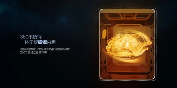 在烤功能模塊,佳歌A6DZK采用耐高溫、耐腐蝕、耐熱性好、一擦即凈的360不銹鋼一體無縫搪瓷內(nèi)膽,同時配備“頂部風(fēng)扇輔熱+食品級加熱管+底部加熱管”三維立體循環(huán)烤系統(tǒng),三維立體加熱讓烤箱內(nèi)每一個角落溫度一致,最高溫度可達(dá)200℃,更大限度保證食物色香味俱全。