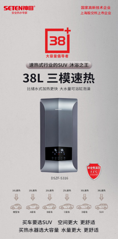 速熱式行業前幾年的主流產品是16L的單模速熱,很多品牌都把精力放在了小容量速熱的開發上。但是,神田經過充分的戰略討論后認為,小容量速熱從設計原理上就決定了它冬天的時候水量就不夠用,所以堅決放棄開發小容量速熱產品。自2019年起,神田開發的速熱產品起步就是20升三模速熱,2020年神田開發出30升大容量速熱,2021年神田又開發出38升大容量速熱。