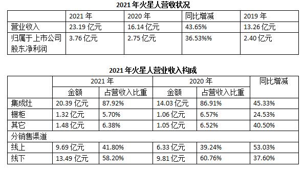 從過去幾年的發展歷程來看,線上線下渠道互融互通,雙輪發展一直是火星人保持高速發展的秘訣。從年報披露的數據來看,2021年火星人線上線下分別貢獻營業收入9.69億元和13.49億元,同比去年分別增長了53.03%和37.60%;其中線上銷售占比提升了2.56百分點到41.80%,線下收入占比為58.2%。奧維云網數據顯示,2021年火星人線上銷售額市占率為23.35%,位列行業第一。