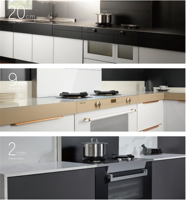 億田高端定制廚房獨創廚電&臺面水平融合系統,實現“寬域窄域,隨心所欲”的尺寸定制,輕松駕馭不同臺面。