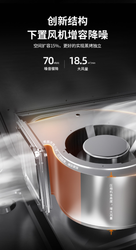 在“側(cè)吸下排”技術(shù)之上,億田S8M蒸烤獨立集成灶深度探索「空間」與「效率」兩大賽道,配置應(yīng)用“下置風(fēng)機”集成科技。相較于傳統(tǒng)背部風(fēng)道,億田下置風(fēng)機結(jié)構(gòu)不僅更符合空氣流體力學(xué)原理,出煙更順滑,而且空間利用效率更高,增容降噪,充分?jǐn)U容大量內(nèi)部有效空間。