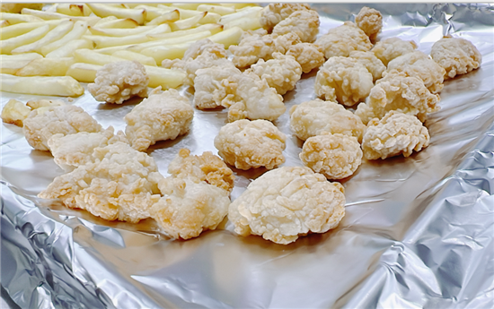 將薯條、雞米花等冷凍的半成品放入烤籃中。空氣炸模式,200℃,15min。這個炸籃是9YC03蒸烤炸款集成灶自帶的,雙明透氣能夠讓食材會更加酥脆,還不用翻面。