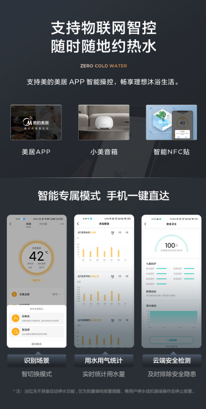 美的一級靜音燃氣熱水器晨曜QT6加持AI智慧云感溫,網絡互聯通過大數據分析和計算,學習用戶的日常調溫習慣,并根據地域天氣溫度、濕度和供暖條件進行調整,智能感溫免去手動調試溫度的煩惱。用戶下載美的美居APP后可連接手機移動端,即可實現遠程操作,能實時看到熱水器的運行狀態,隨時隨地預約熱水、查看用水用氣報告,熱水器大小動態盡在掌握之中,運籌帷幄就是如此簡單。