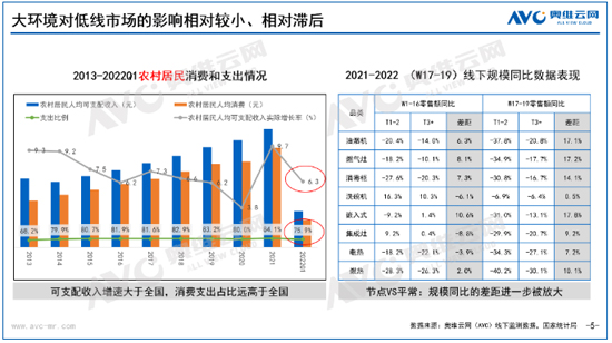 但是,農村市場的整體消費情況要好于整體市場。從國家統計局數據來看,2022年一季度農村居民的可支配收入增速大于整體,消費支出占比遠高于整體。就疫情的影響而言,低線市場相對要弱一些,也要滯后一些。同樣對比奧維云網(AVC)線下監測數據來看,2022年“五一”(W17-19)節點的各品類在T3+市場的同比情況要遠好于T1-2市場,而且這一同比的差距在“五一”節點要比前期(W1-16)更加明顯。