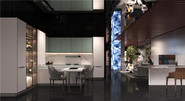 又延伸出餐桌,餐廚一體,拓展了空間的尺度,搭建起情感互動(dòng)的場(chǎng)所,注入生機(jī)與靈動(dòng)。