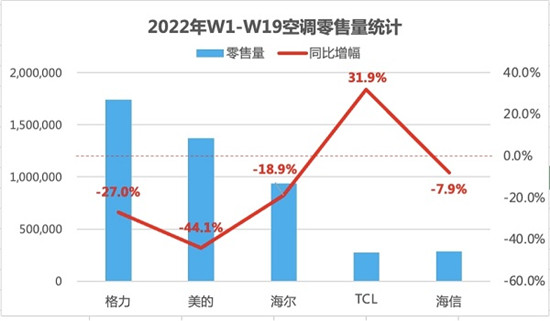 據中怡康線上+線下空調周度監測報告顯示,截止2022年5月8日,2022年中國空調市場零售量排名前五的品牌中,格力、美的、海爾、海信均出現負增長,TCL空調成為銷量前五的品牌中唯一實現增長的品牌,同比增長31.9%。
