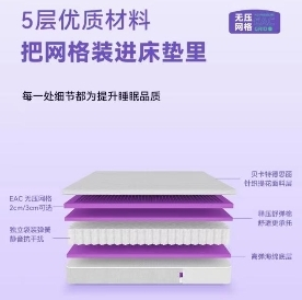 傳統的床墊都是以彈簧、乳膠、棕絲、海綿等材料組合而成,而Qrua則使用了新型材料——EAC。這種紫色的網狀材料,官方闡述為“Elastic-有彈性的、Air-空氣感的、Compressors-壓縮”。言簡意賅地向人們概括了它的特性和優點。EAC作為傳統TPE的升級材料,更具彈性和透氣性,耐用且實用。這也是未來床墊的發展方向,睡感和質量兩手抓。