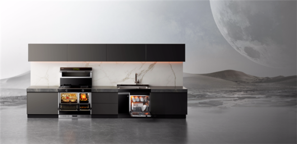 橫向上,以集“煙、灶、蒸、烤、空氣炸”為一體的蒸烤獨立集成灶,以及集“水槽、洗碗、果蔬清洗、廚余處理、加熱烘干”等于一體的集成水槽洗碗機,組成一平米的洗切烹動線;縱向上,以煙機-灶具-蒸-烤-空氣炸,以及水槽-果蔬清洗-洗碗-廚余處理-烘干,形成固定一個點上便可實現『智能烹飪+鮮蔬餐具洗』動線;通過數據協同實現跨品類的互聯互通,以言屏雙控實現功能啟動與操作,在智能生態下讓廚房生活更加條理、便捷、高效,引領“無人廚房”時代。