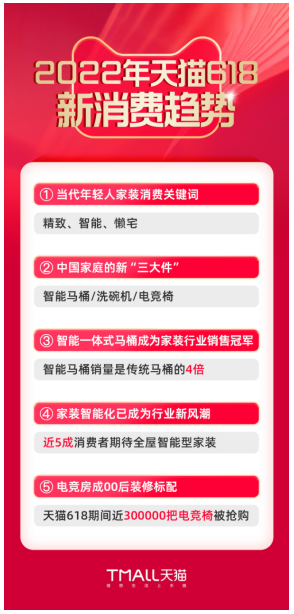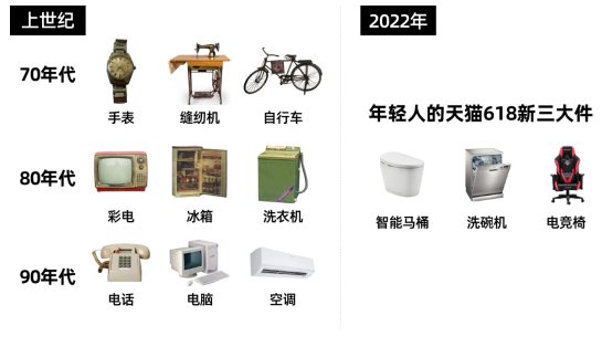 近日,天貓新生活研究所發布《2022年天貓618新消費趨勢》,指出“洗碗機、智能馬桶、電競椅”已取代90年代的“電話、電腦、空調”成為中國家庭的“新三大件”。居家生活消費不僅僅是基礎的衣食住行,更延伸到更高品質的生活場景,以及更健康、舒適的生活體驗。