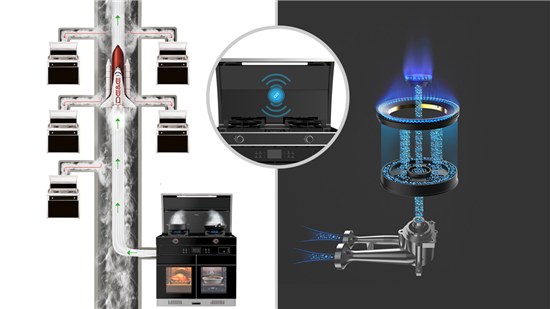 除了上面說的“均衡”新功能,德意蒸烤均衡集成灶也完美地“繼承”了德意三“大”集成灶“大風壓/大火力/大空間”的優秀基因。900Pa大風壓搭配大吸力,強排油煙不倒灌;5.2kW大火力,創新POWER大火力燃燒系統成就大廚級中式爆炒。而智能煙灶聯動功能將二者默契銜接,灶具點火時,煙機即刻啟動,灶具關閉時,煙機再運行三分鐘排盡余煙后自動關閉。