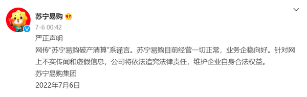 對此,蘇寧易購官方回應稱,該消息系謠言。蘇寧易購目前經(jīng)營一切正常,業(yè)務企穩(wěn)向好。針對網(wǎng)上不實傳聞和虛假信息,公司將依法追究法律責任,維護企業(yè)自身合法權(quán)益。