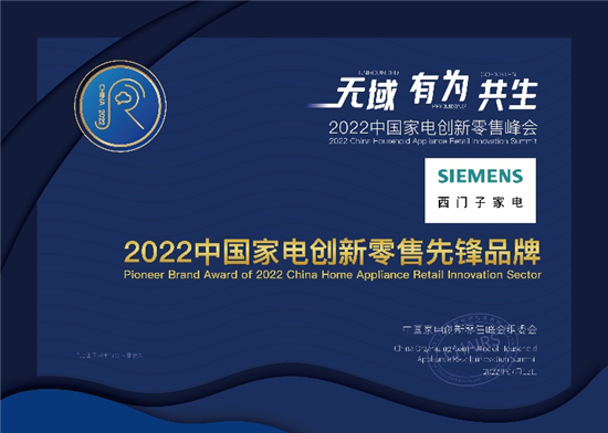 西門子家電榮獲“2022中國(guó)家電創(chuàng)新零售先鋒品牌獎(jiǎng)”