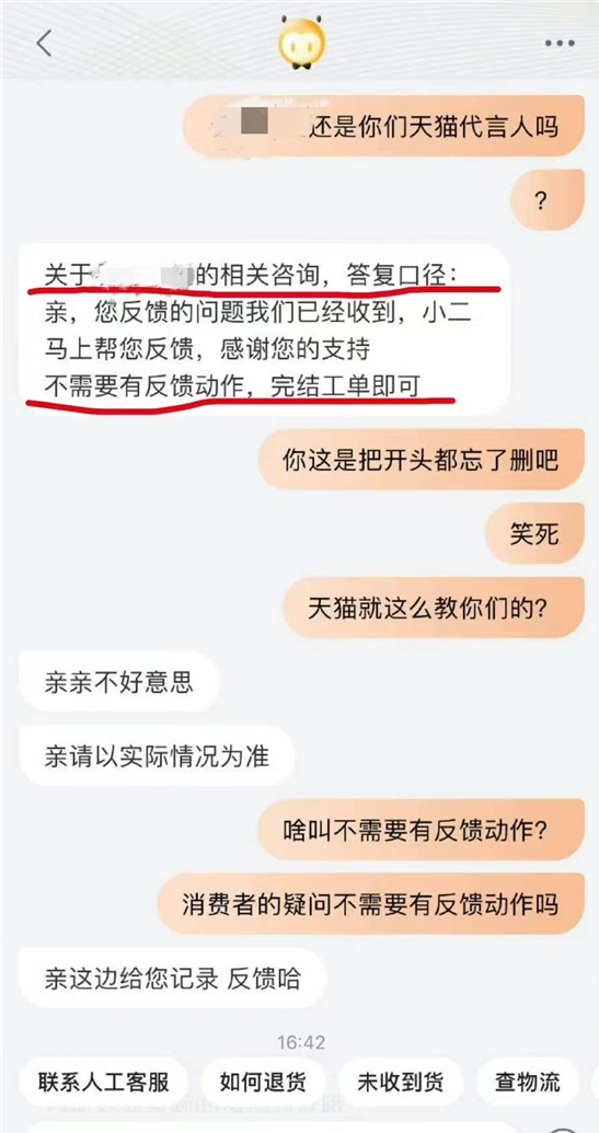 但是,這種對于消費者的背刺行為并不少見,往近期看,鬧得沸沸揚揚的明星考編事件,在部分網友從代言品牌、合作品牌和綜藝節目贊助商三個途徑入手,試圖對事件當事人進行施壓時,涉及的不少品牌在客服端和直播間的傲慢發聲都令人很氣憤:輕則用統一模板進行敷衍——將“將會進行反映”,甚至忘記刪除話術模板后“不需要有反饋動作”的字樣;重則直接在直播間嘲諷消費者——“吃飽了撐得”。