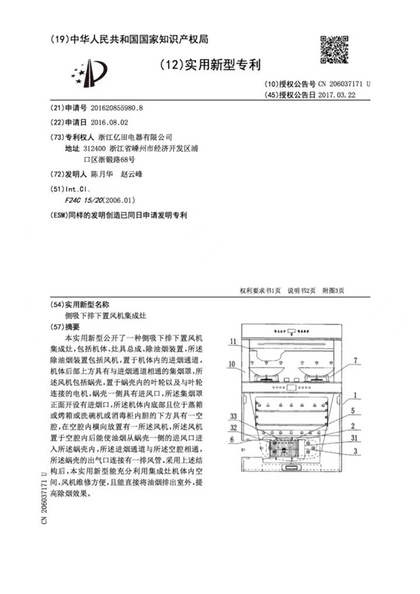 其中,下置風(fēng)機技術(shù)(專利號:ZL 2016 2 0855980.8),是億田聯(lián)合浙江理工大學(xué)歷時735天研發(fā)的結(jié)晶。該項技術(shù),將集成灶機身背部風(fēng)機系統(tǒng)創(chuàng)新移至底部,從而使機身前后縱向空間釋放12cm,空間容量提升15%,這為蒸烤獨立集成灶的分腔奠定了空間的堅實基礎(chǔ)。
