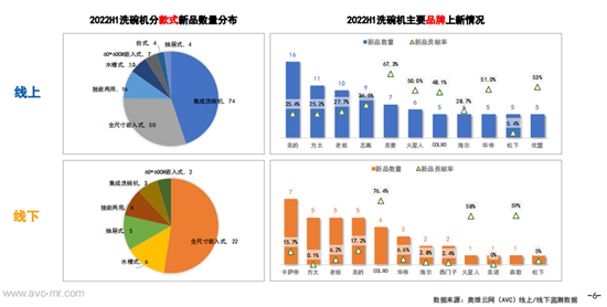 從新品布局來看,集成洗碗機成線上市場新品布局重點。據奧維云網(AVC)監測數據顯示,2022年上半年線上市場集成洗碗機新品數量達74款,遠超位居第二的全尺寸嵌入式50款。同時,多個品牌新品貢獻率超50%。