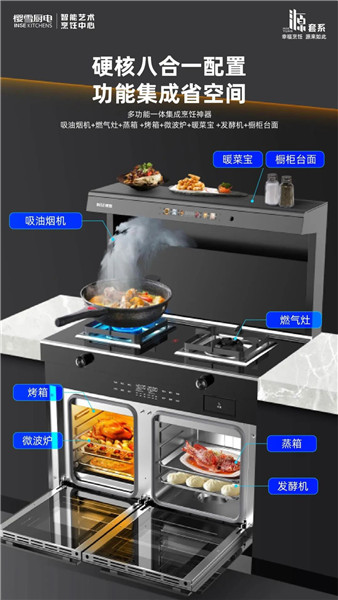 為滿足消費人群愈加細分的烹飪需求,提供更多烹飪選擇,繼消毒柜款、蒸烤一體款集成灶后,櫻雪進一步擴充產(chǎn)品結構類型,推出蒸烤獨立集成灶——櫻雪智能語音集成灶2202。