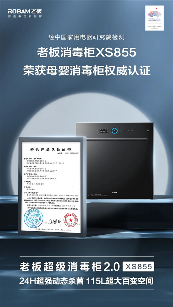 老板電器消毒柜XS855、XD706由中國家用電器研究院依照RZB086-2022《特色產品認證技術規范母嬰消毒柜性能認證技術要求》進行產品檢測。檢測報告顯示,老板母嬰消毒柜碗架和內膽均符合材料衛生健康要求,并且對易致病的單核增生李斯特氏菌、黃曲霉殺菌率達99.99%,從源頭保障了母嬰人群使用健康,隔絕致病細菌帶來的危害。