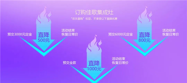 訂購佳歌集成灶,預交全款即可享受直降1000元大牌價到優惠。
