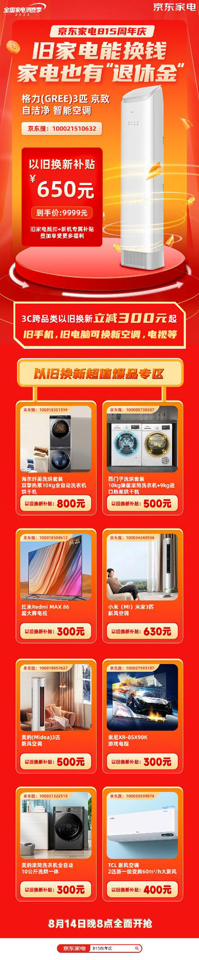 煥新生活不等待!8月14日晚8點,京東“815”周年慶全面開搶,以下清單中多款家電爆品均可領取豐厚換新補貼,趕緊收藏關注吧!