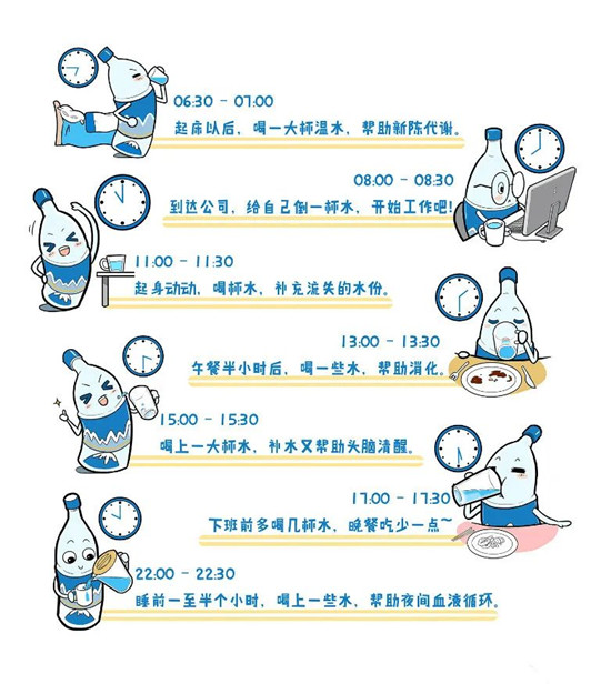 一日之計在于晨,晨起喝一杯溫開水幫助身體清理腸胃,排除體內(nèi)毒素;兩餐之間飲水,可以加強身體的消化功能;睡覺前適量飲水,幫助機體沖淡積壓液,擴張血管,有益于身體健康;劇烈活動或鍛煉之后,不要立刻飲用大量的水,先緩一緩再飲水會更好。