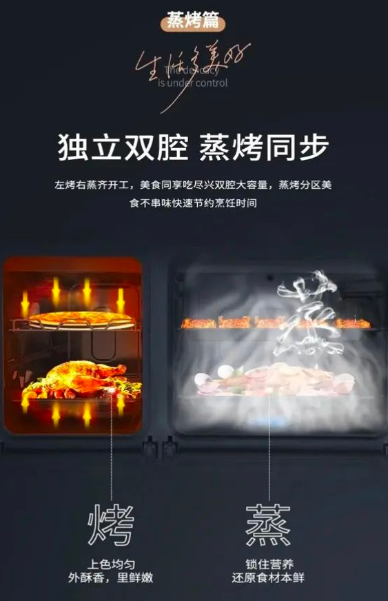 美多語音分蒸烤集成灶突破傳統蒸烤一體機結構,創造性地締造了左烤箱、右蒸箱功能,確保了蒸和烤之間不會串味,同樣是高烹飪效率的體驗,卻可以同時get蒸和烤的樂趣。實現了邊蒸邊烤不串味,烹飪效率更加倍的下廚體驗,產生了1+1>2的效果,讓家庭烹飪更高效、節能、多樣化,滿足家人不同的飲食需求。