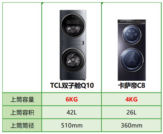 一臺洗衣機最重要的莫過于洗滌容量,這也是所有消費者對于洗衣機的基本要求。根據TCL公布的數據,TCL雙子艙Q10的總洗滌容量是16kg,其中上筒容量是6kg,創造了行業最高記錄。而卡薩帝C8總洗滌容量是14kg,上筒容量只有4kg。