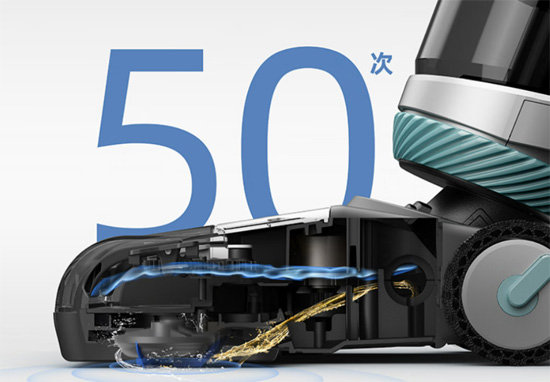 在設計形態上,米博無滾布洗地機沒有滾布結構,搭載的高分子PVC地刷更容易清潔,不會出現藏污的情況、活水系統避免水箱污染……