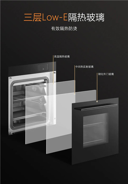 此外,蒸烤箱搭載Low-E隔熱玻璃——高溫隔熱玻璃、中間熱反射隔熱玻璃和鋼化外門玻璃,三重防護,無需承擔玻璃門高溫燙傷的風險,整個烹飪過程也更加安全自由!