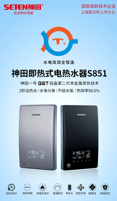 神田S851采用了“雙芯雙核硅晶加熱+水電雙調(diào)全恒溫+溜背式亞克力面板+超大屏幕顯示”的設計理念,核心的發(fā)熱技術(shù)、恒溫技術(shù)都是行業(yè)領(lǐng)先的,在外觀設計上,超大屏幕與溜背式設計也整體提升了即熱式產(chǎn)品的美感。傳統(tǒng)的即熱式產(chǎn)品大都是普通玻璃面板風格,S851的高光度亞克力面板給行業(yè)帶來一股全新的設計風格。