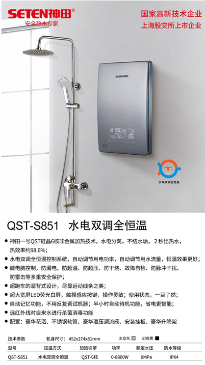 神田S851在發(fā)熱技術(shù)上是硅晶加熱,在恒溫技術(shù)上是水電雙調(diào)全恒溫,面板采用超跑車的溜背式設計,超大寬屏LED熒光白屏。S851也具備自動記憶功能、半小時自動待機功能等智能化功能。
