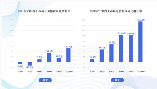 近兩年洗衣機市場消費結構升級態勢顯著。僅2021年“十一”期間,6K-10K價格段市場份額占比,線上由去年同期的9.4%漲至9.9%,線下由31.4%漲至35.4%;10K以上(含10K)價格段市場份額占比,線上由去年同期的3.3%漲至3.9%,線下由11.7%漲至17.0%。單純“入門級產品”已不能滿足消費者的需求。