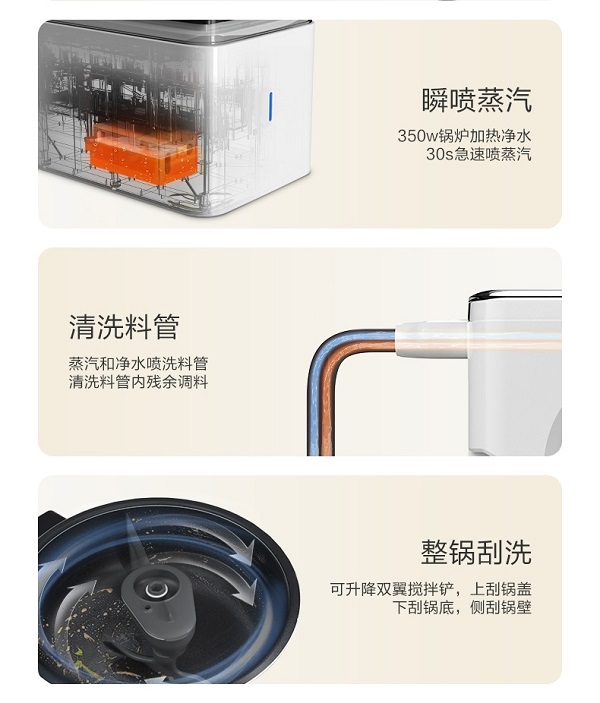 為了讓用戶擁有更好的不洗鍋體驗,食萬3.0 Pro在原有自清潔基礎上增加了小型鍋爐加熱裝置,它能自動加熱凈水,通過急速升溫、30s迅速噴發高溫蒸汽有效殺滅大腸桿菌、金黃色葡萄球菌、白色念珠菌等常見病菌,不僅實現鍋體自清潔,還包括匯料區至輸料管的整體清潔,不留死角,保障全家人的入口安全健康,使用不僅省心,也更放心。